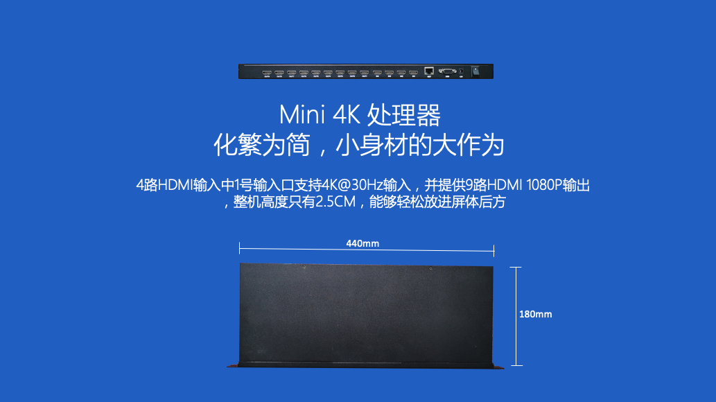 Mini 4K拼接器专为小规模拼接系统设计制作,不足1U的机身高度使它能够轻松的被放置在壁挂安装的液晶或者LED显示屏后部。