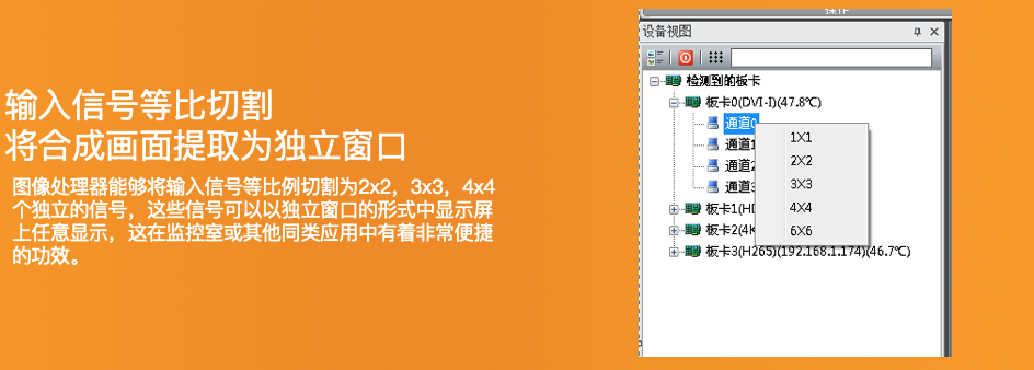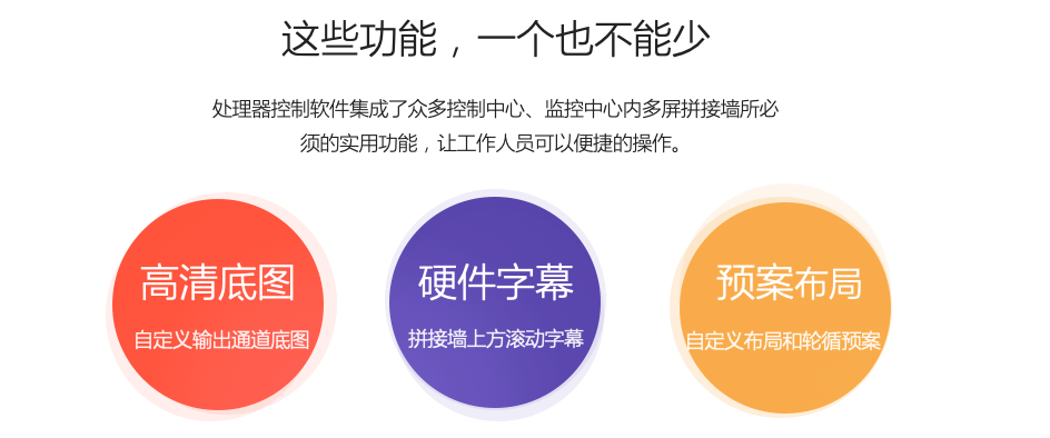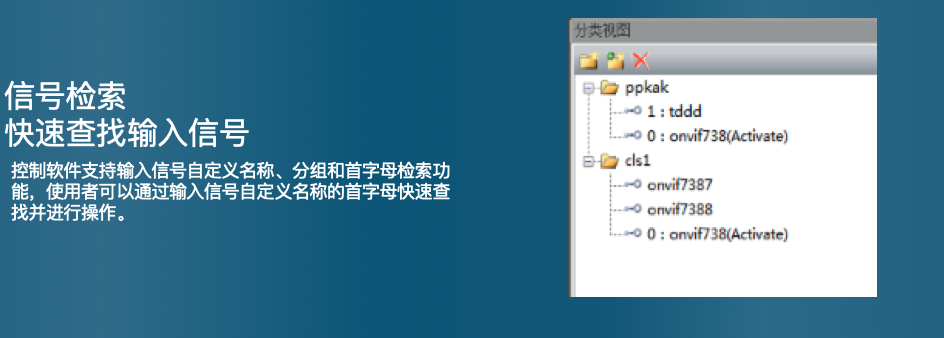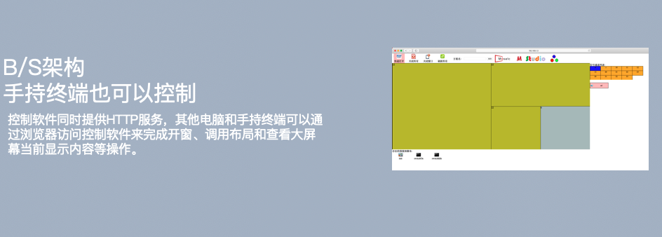 控制器配套的高集成度的控制软件,可在同一个软件内控制拼接控制器和周边联控的矩阵等设备,实现在一个软件内控制整个系统。控制器真正的网络接口使得控制软件能够通过网络控制多台拼接控制器或多人控制一台拼接控制器的应用。 这就为实现复杂的多个大屏或分布式显示系统提供了有效的控制手段,使复杂环境的控制简单化。拼接控制器还提供了开放的网络控制命令集与RS-232串口控制命令集,用户可根据自己的需要进行二次开发。